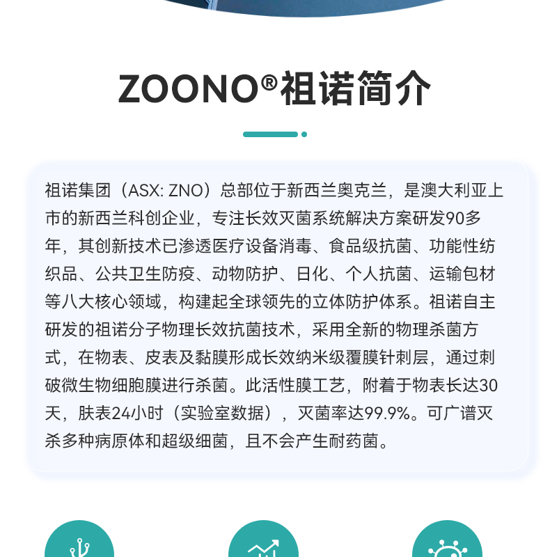 A: Zoono is 99% water-based sanitizer, our unique germ popping technology is a vital part of it. It creates a 24 hours long-lasting protective shield against 99.9% of bacteria. Safety similar as Vitamine C.